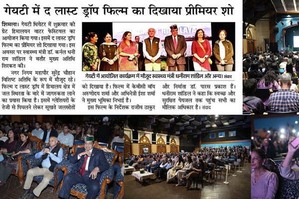 Chief Minister Sukhvinder Singh Sukhu attended a special screening of The Last Drop, a short film highlighting the alarming issue of melting glaciers and climate change. The 25-minute film, featuring Kaun Banega Crorepati (KBC) fame Arunoday Sharma and Pashmina fame Isha Sharma created by Dr Paras Prakash, was officially launched during The Great Himalayan Water Festival in Shimla held in August 2025.